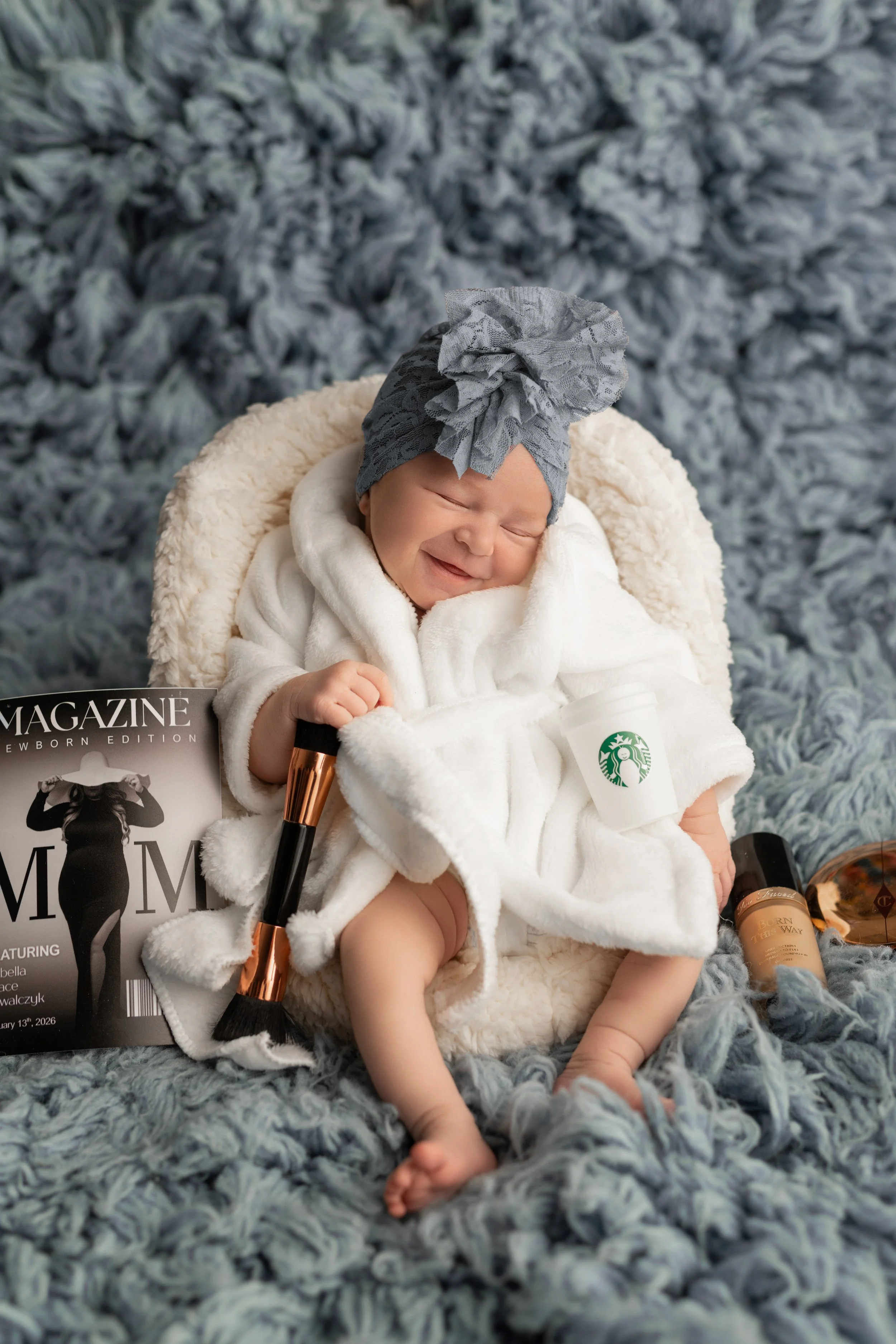 We begin with soft wrapped poses, which help baby feel secure and comfortable. From there, we gently transition into additional poses using wraps, blankets, and outfits from our gorgeous closet.